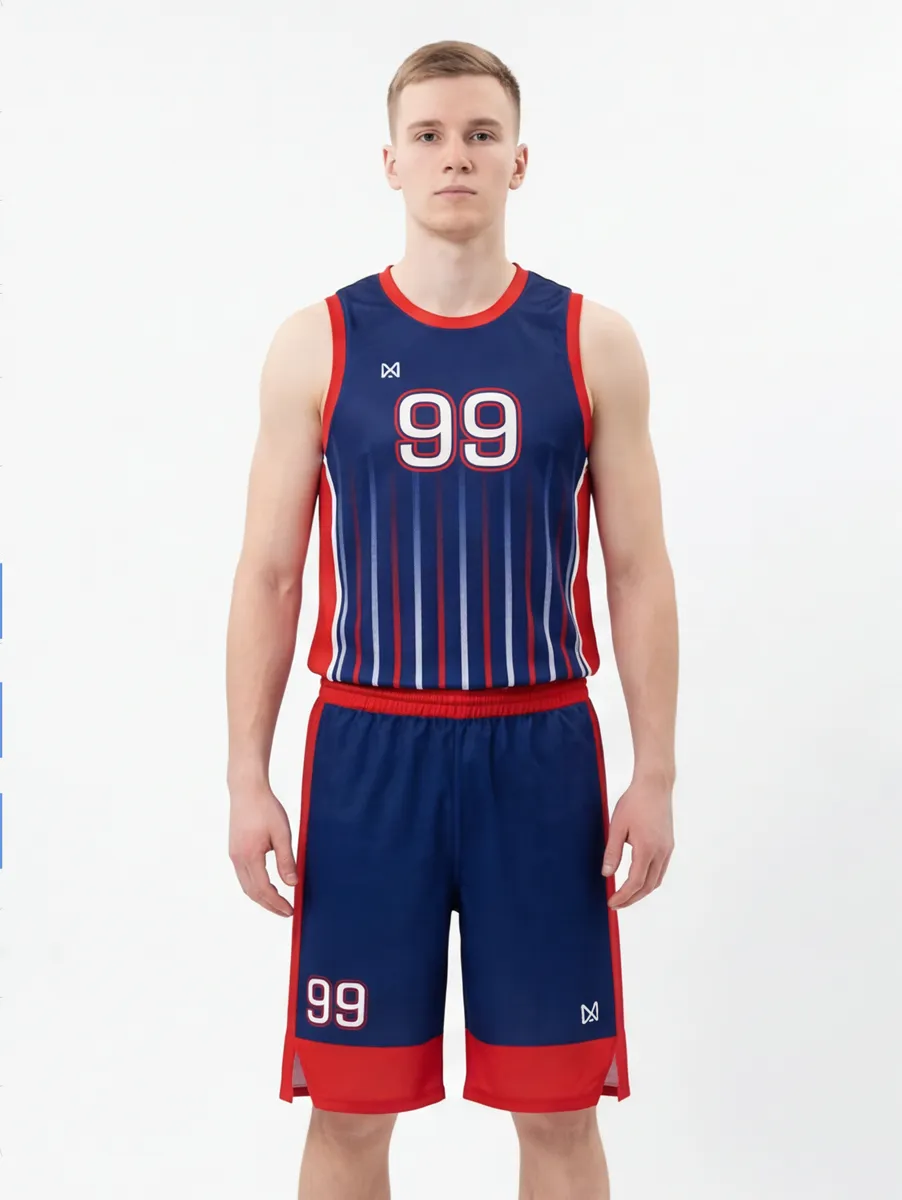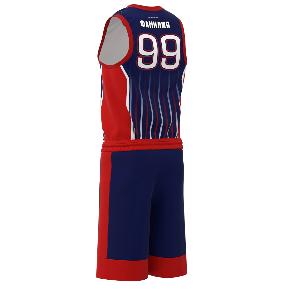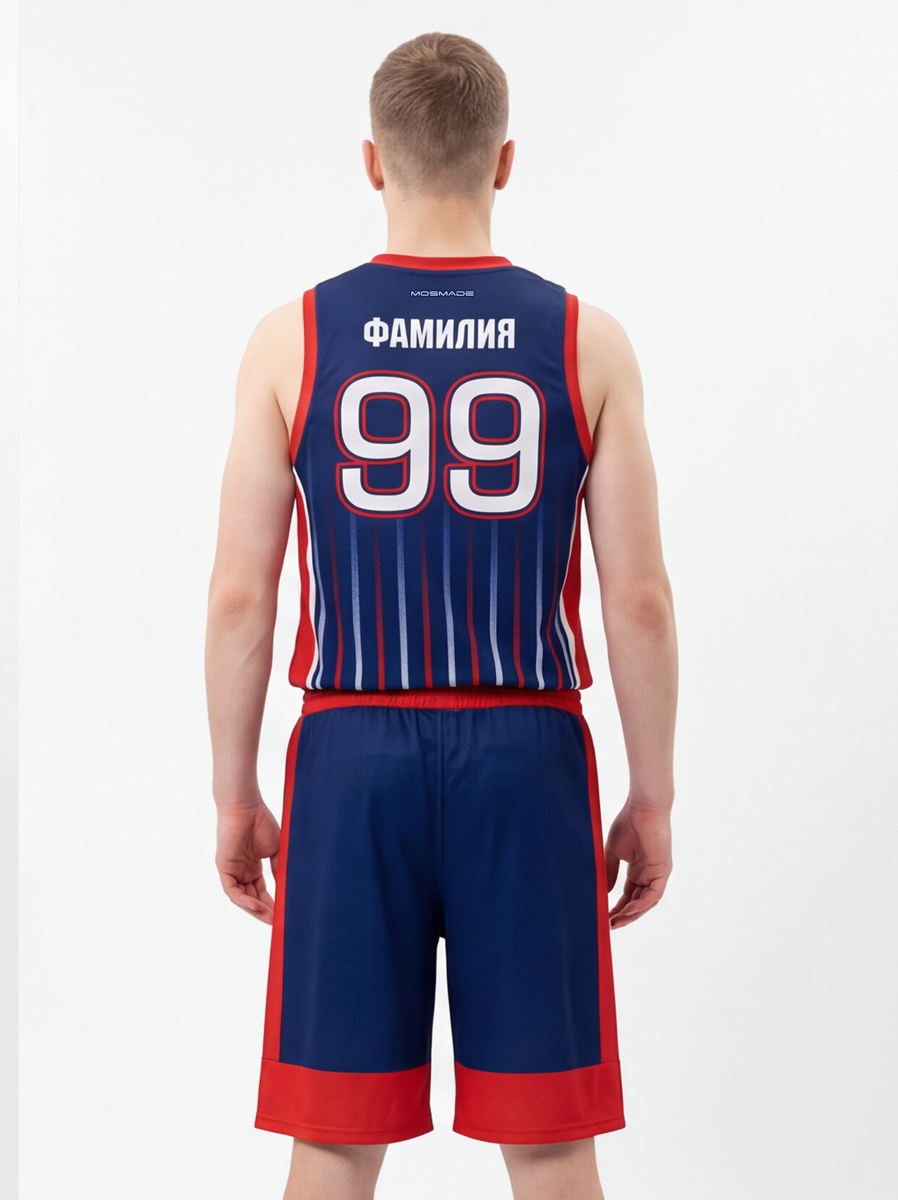 Баскетбольная форма на заказ. Комплект формы состоит из майки и шорт. Модель майки свободная с боковыми вставками. Майка прямого кроя с О-образным вырезом. Шорты прямые, свободные.