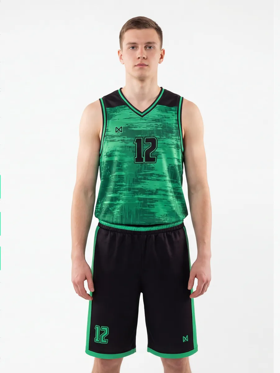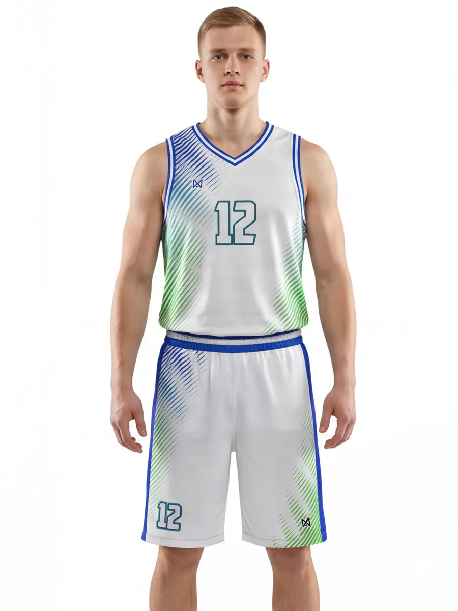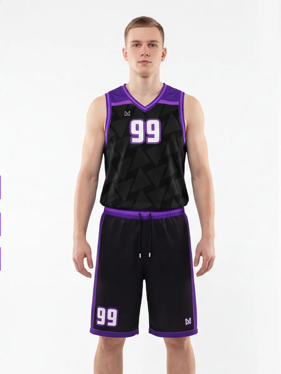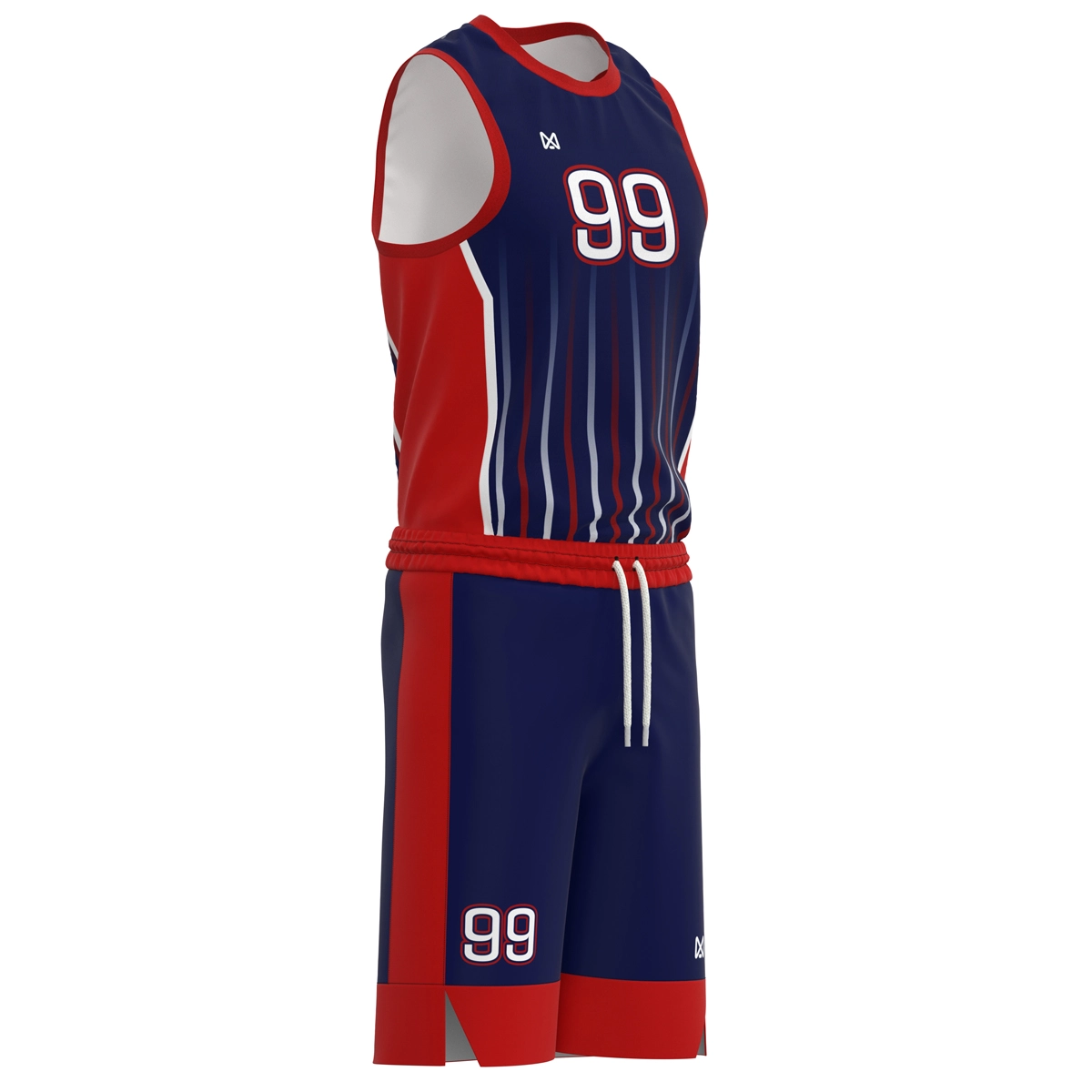 Баскетбольная форма на заказ. Комплект формы состоит из майки и шорт. Модель майки свободная с боковыми вставками. Майка прямого кроя с О-образным вырезом. Шорты прямые, свободные.