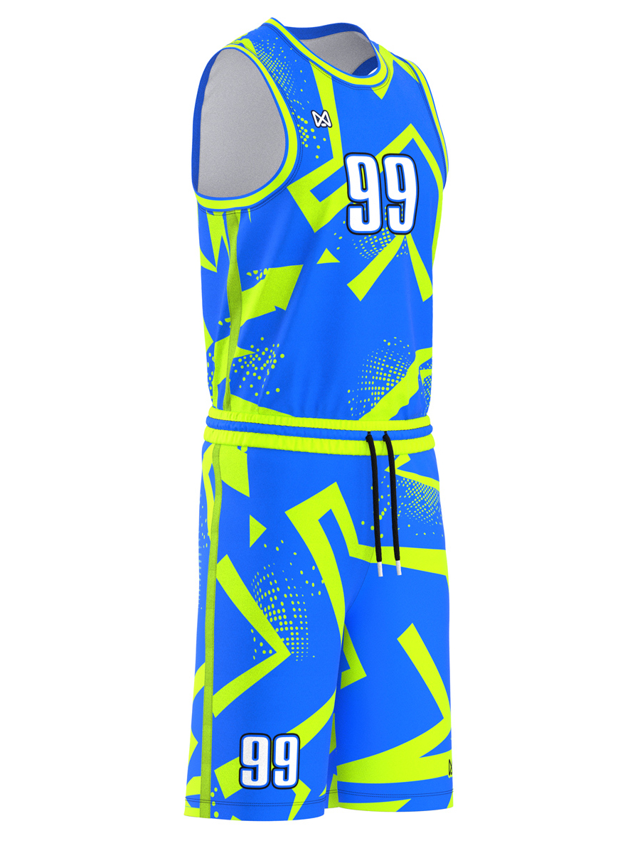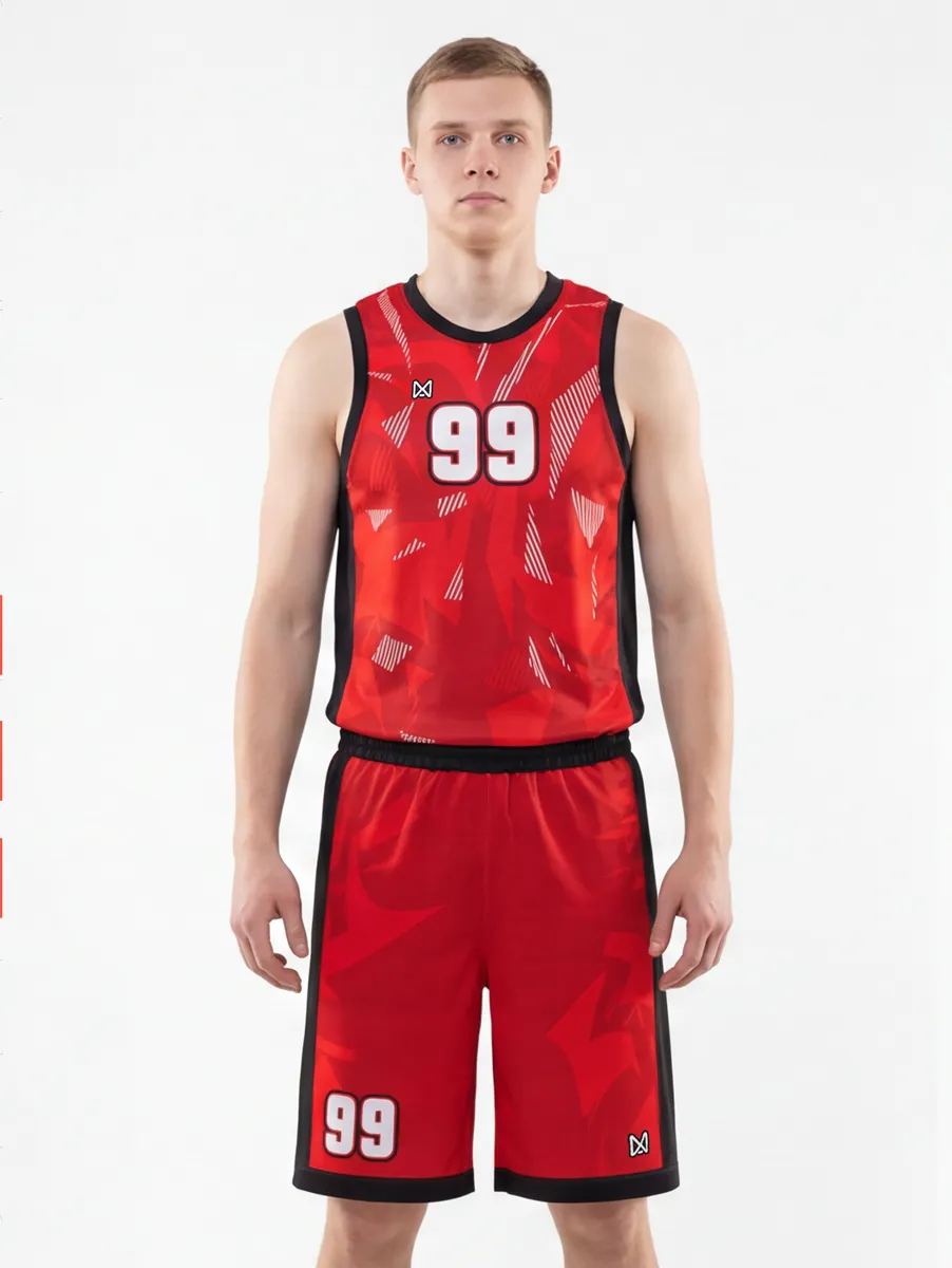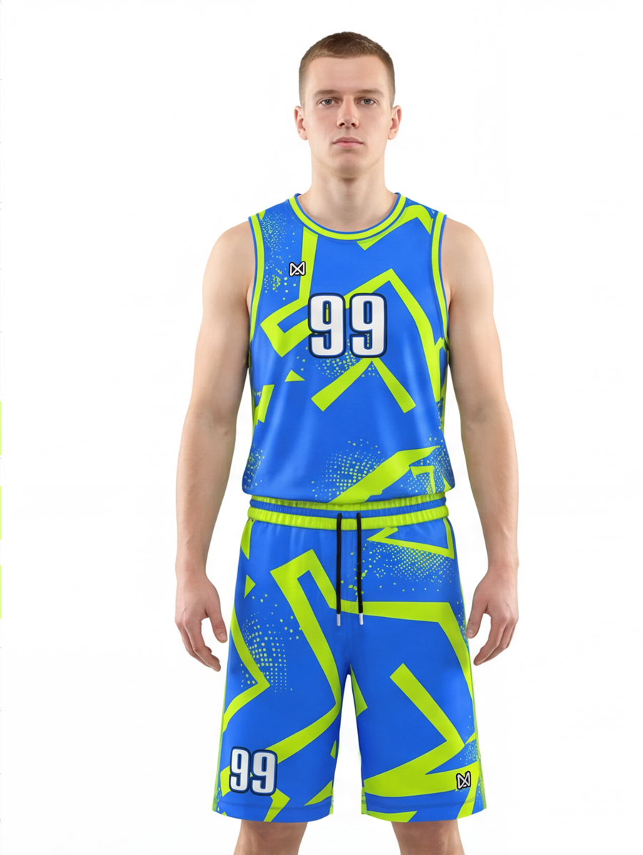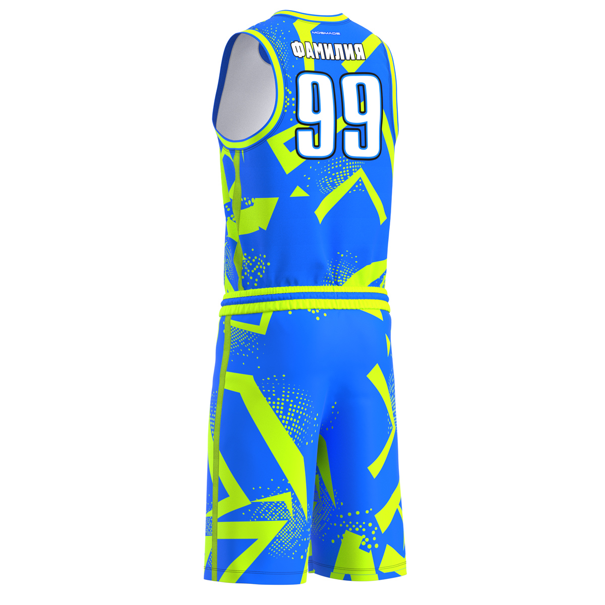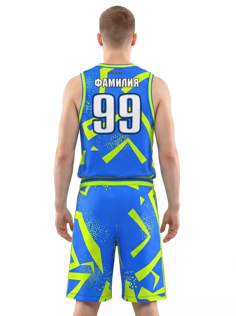 Баскетбольная форма на заказ. Комплект формы состоит из майки и шорт. Модель майки свободная с боковыми вставками. Майка прямого кроя с O-образным вырезом. Шорты прямые, свободные.