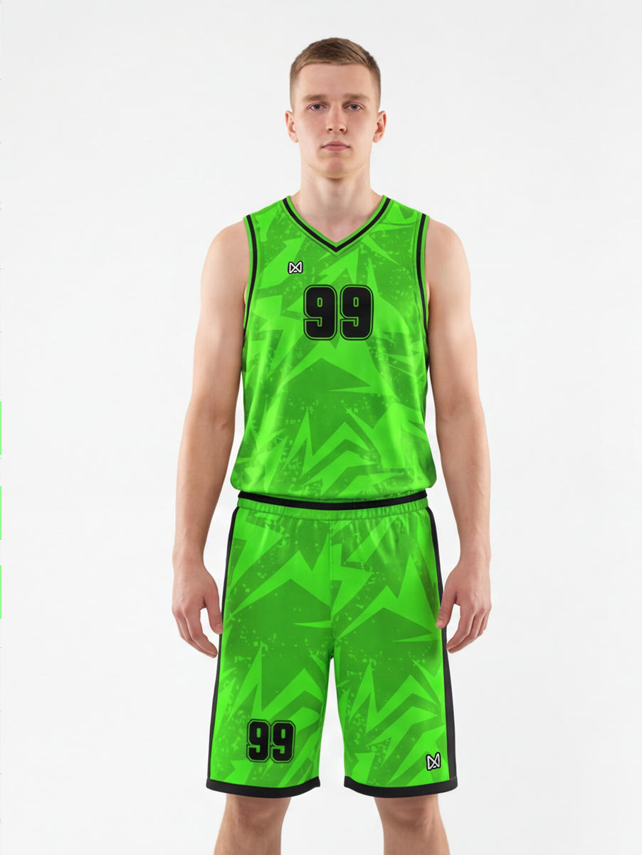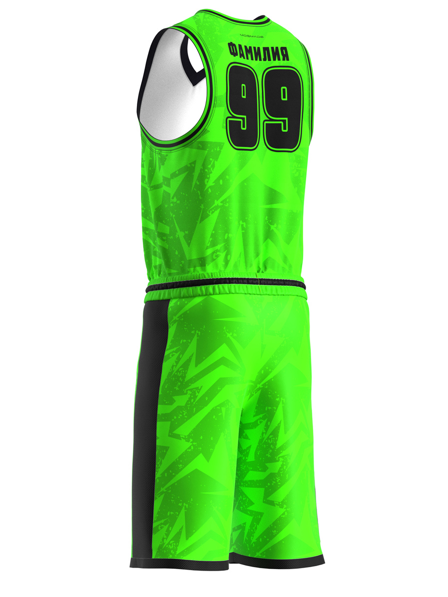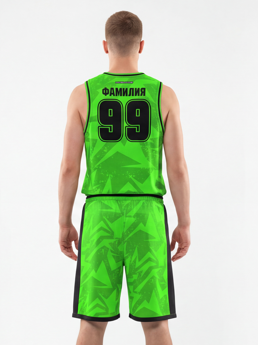Баскетбольная форма на заказ. Комплект формы состоит из майки и шорт. Модель майки свободная. Майка прямого кроя с V-образным вырезом. Шорты прямые, свободные.