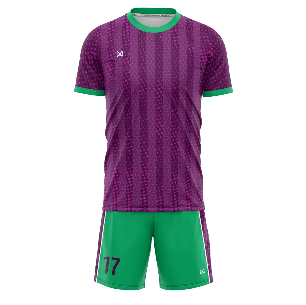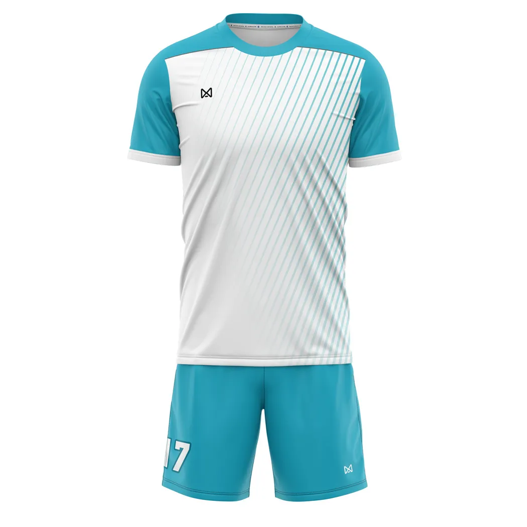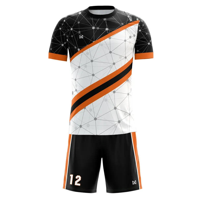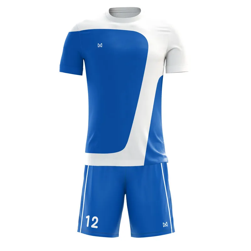 Комплект футбольной формы для занятия спортом. Комплект футбольной формы состоит из футболки и шорт. Модель футболки свободная, прямого кроя с O-образным вырезом, короткие рукава. Шорты прямые, свободные.