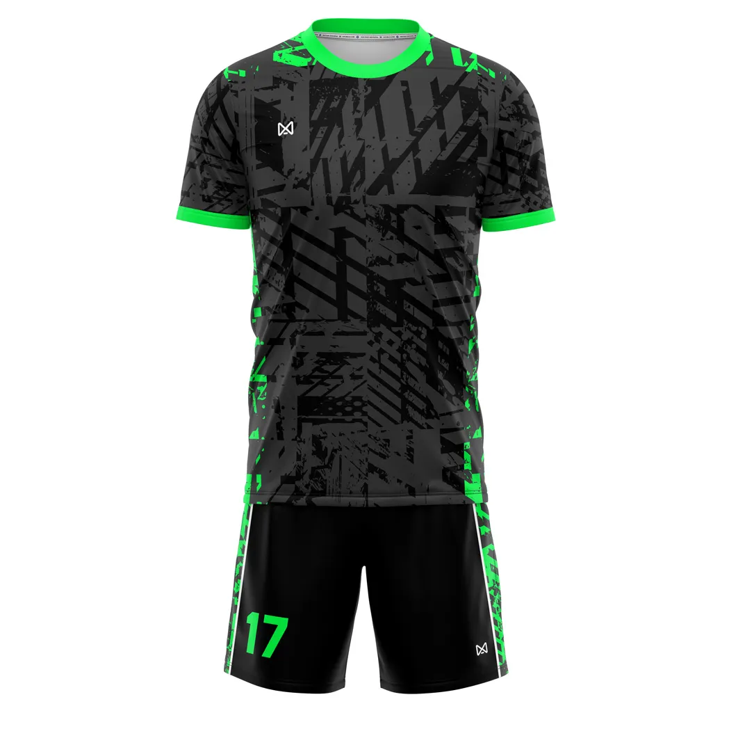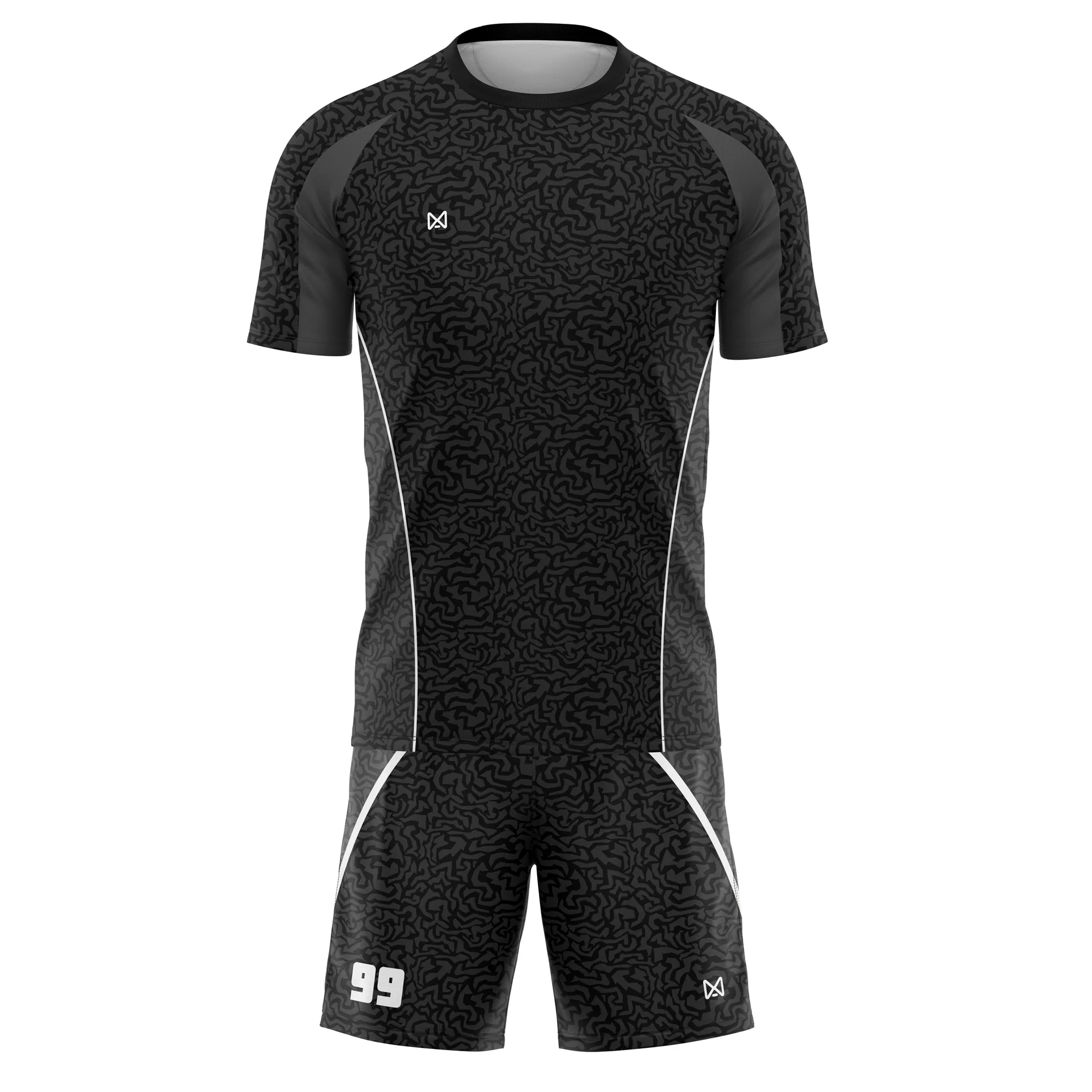 Комплект футбольной формы для занятия спортом. Комплект футбольной формы состоит из футболки и шорт. Модель футболки свободная, прямого кроя с О-образным вырезом, длинные рукава. Шорты прямые, свободные.