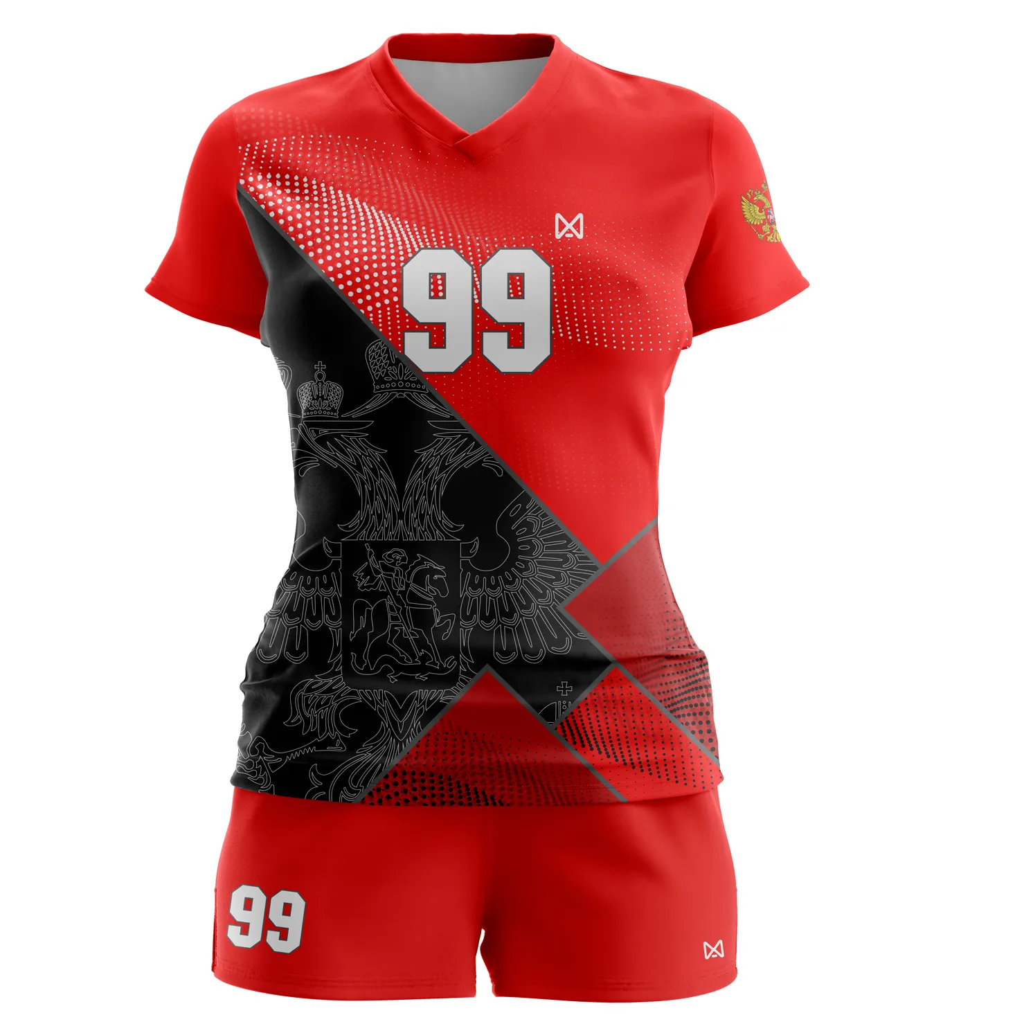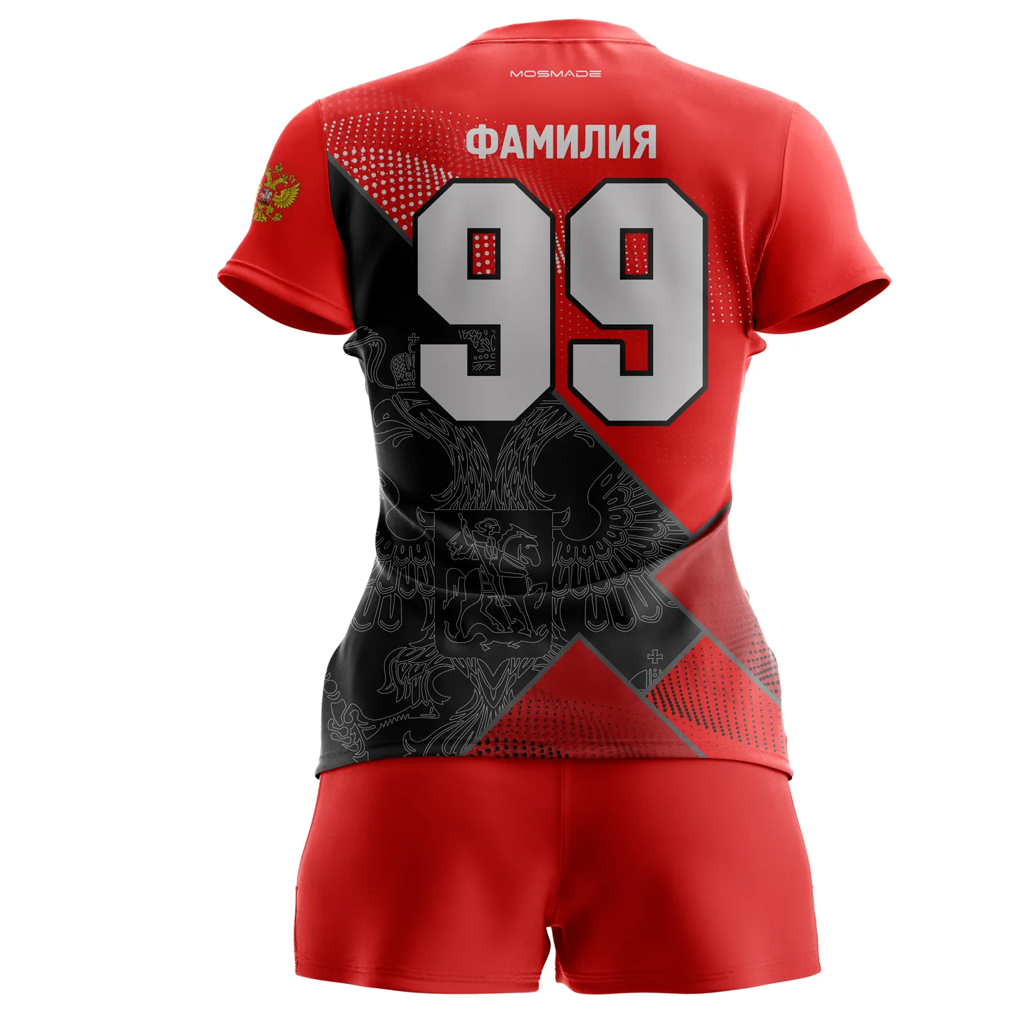 Женская волейбольная форма на заказ. Комплект формы состоит из футболки и шорт. Модель футболки свободная, приталенная. Футболка прямого кроя с V-образным вырезом, короткие втачные рукава. Шорты прямые, свободные.