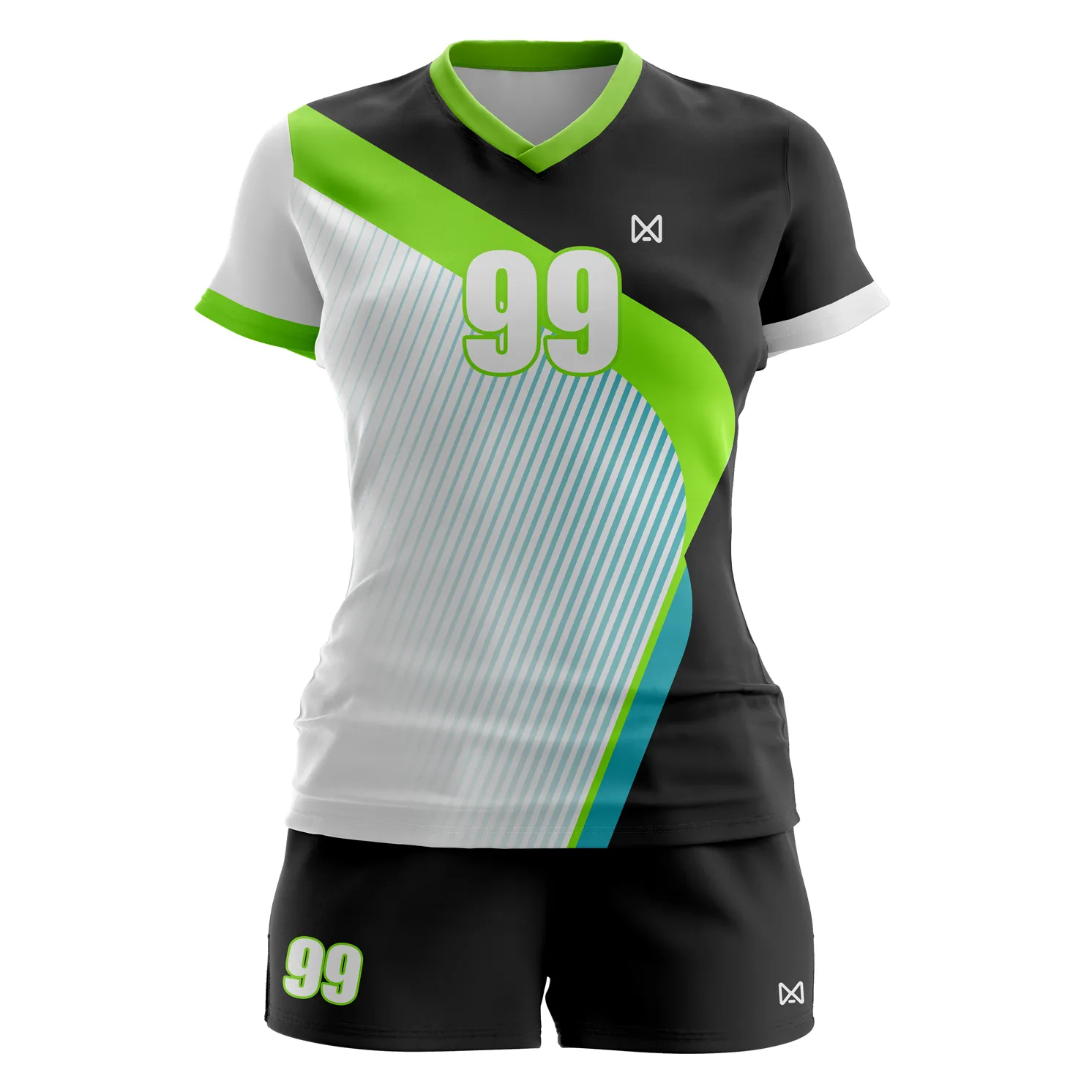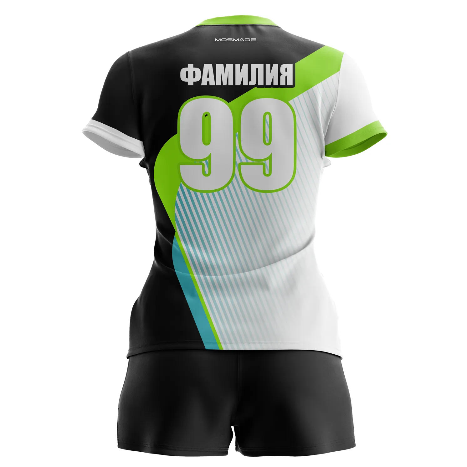 Женская волейбольная форма на заказ. Комплект формы состоит из футболки и шорт. Модель футболки свободная, приталенная. Футболка прямого кроя с V-образным вырезом, короткие втачные рукава. Шорты прямые, свободные.